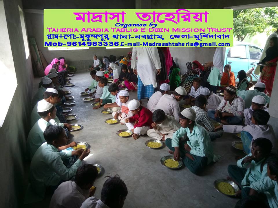Murshidabad is one of the backward and poorest districts in West Bengal. Here, 67% population is from the Muslim community and they belong to a backward and poor family. Most of the people here are labor and farmer they may travel to other states for their labor work. Our organization Taheria Arabia Tablig-E-Deen Mission is situated in Mukundapur village of Murshidabad district. We established this organization for social work. We also run a Madrasah under this organization for Islamic education as well as general education. The name of the madrasah is MADRASAH TAHERIA, studying 200 students (including girls) and they are all coming from the poor family learn here for free of cost. Boarding students are also preserved to stay and learn